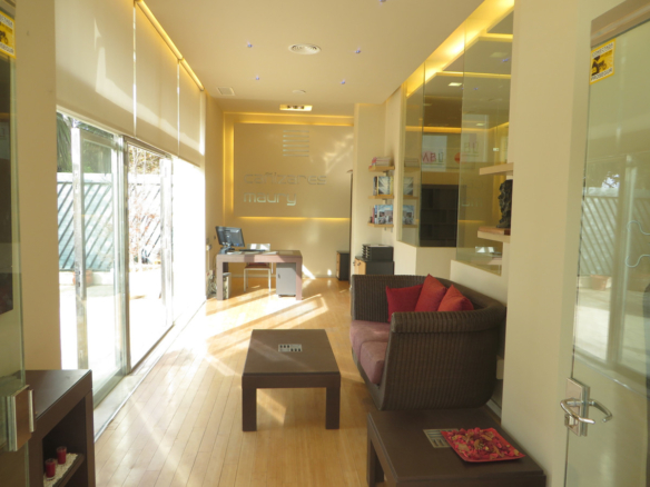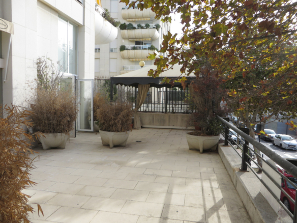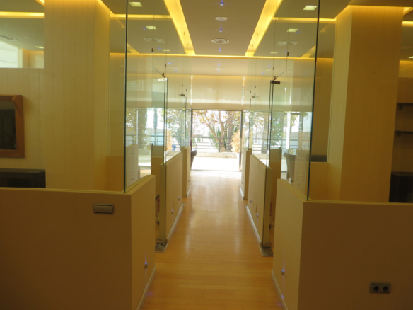 a room with a small living room with this fantastic terrace on your left, on your right 4 more offices in the background there is a large meeting room,