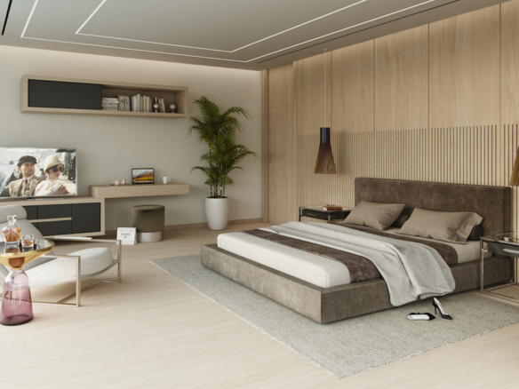The master bedroom includes a large dressing room with fitted wardrobes, private terrace with solarium and chill-out area.
